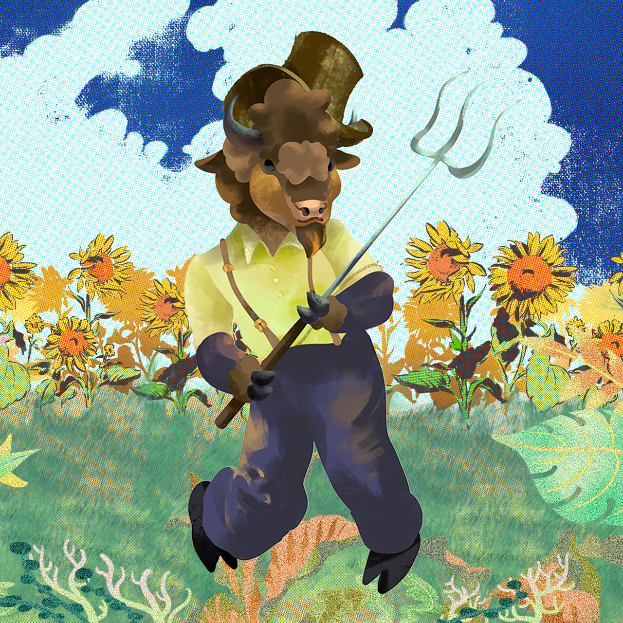 The ox is inspired by the high carbon emissions farm stocking industry. The innocent ox can’t do anything about it. The alien cat is the high intelligent version of ourselves that we need to bring out to solve global issues. The bird holding the sunflower is the peacemaker which also represents liberty and democracy.