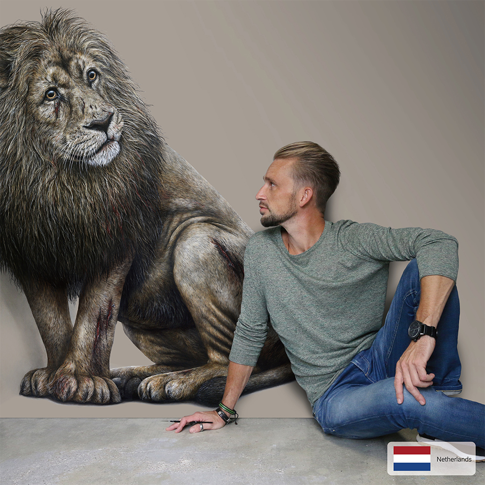 在單色背景下畫出幾乎與真人一樣大的動物。