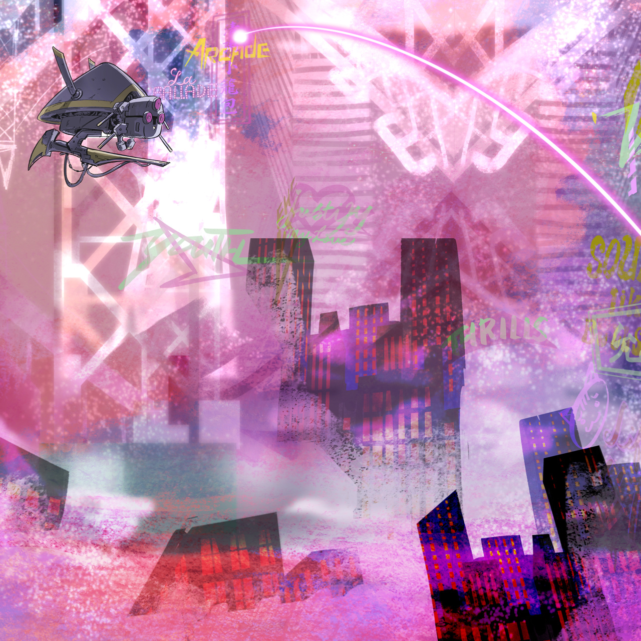 背景是cyberpunk的霓虹城市,同時也代表了霧霾所帶給城市的一種朦朧浪漫感,雖然很美有氣氛但是有害,所以用裝飾線條裝飾天空表現這種現象。