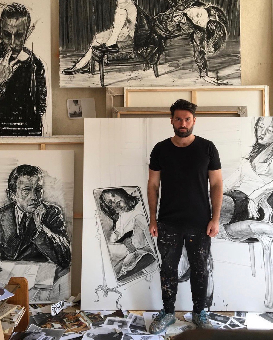 在具象和流行文化的十字路口,Tomas Jetela的作品的本質在於手勢、神情和臉部的磁性表現力。線條既活潑又精確,精闢,就像他的簽名。他經常將繪畫和紙屑(人物、句子或文字)的拼貼混合在一起,為繪畫敘事增加了一個新的原創維度;在故事中的故事。這既是對人和他在社會中的地位的反映;也是一種有人居住的孤獨感。